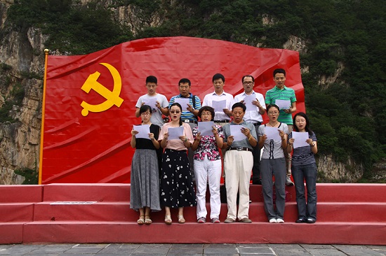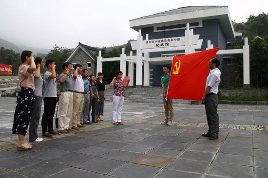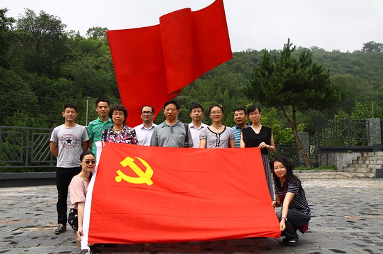 在纪念馆前,支部党员面对党旗,重温入党誓词,时刻牢记党的宗旨和理想,牢记自己的党员身份,用实际行动践行共产主义精神。随后,在广场上巨大的中国共产党党旗前,深情地唱响红歌《没有共产党就没有新中国》,表达了我们对党成立95周年的真挚祝福。