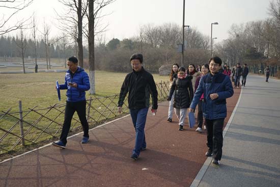 下午,团员青年奔赴奥林匹克森林公园进行了“弘扬长征精神”健步行活动。当天公园上空雾开霾散,天蓝气爽,团员青年们个个精神抖擞,朝气蓬勃。随着曹举副书记宣布“弘扬长征精神”健步行活动开始,大家争先恐后开始了5公里的健步行比拼。活动现场“行军”气氛激昂,途中进行的“长征大事件讲述”、“长征知识竞赛问答”更是精彩热烈。7个团支部代表分别讲述了“万里长征自此始”—“强渡湘江”—“遵义会议”—“四渡赤水”—“彝海结盟”—“强渡大渡河、飞夺泸定桥” —“过雪山草地”七个长征大事件,通过形象、生动、声情并茂以及通俗幽默的讲述,再现了那一段段光辉的历史事件,展现了一幅幅艰苦卓绝、感人至深的长征画面,清晰梳理了长征这一战略大转移的历史脉落。