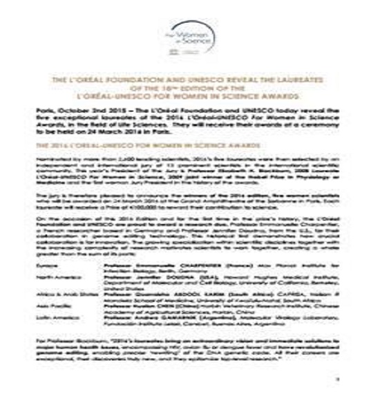 “世界杰出女科学家成就奖”由联合国教科文组织和法国欧莱雅集团于1998年共同创立,旨在表彰女科学家的杰出成就,对她们所做出的卓越贡献给予充分的认可,并为其科研事业提供支持。该奖项每年在5个代表区域(欧洲、北美洲、非洲及阿拉伯国家、亚洲及太平洋地区、拉丁美洲)各选出1名女科学家进行奖励。至今,中国(包括中国香港在内)共有5位女科学家获得该奖项,颁奖仪式将于2016年3月24日在巴黎举行。